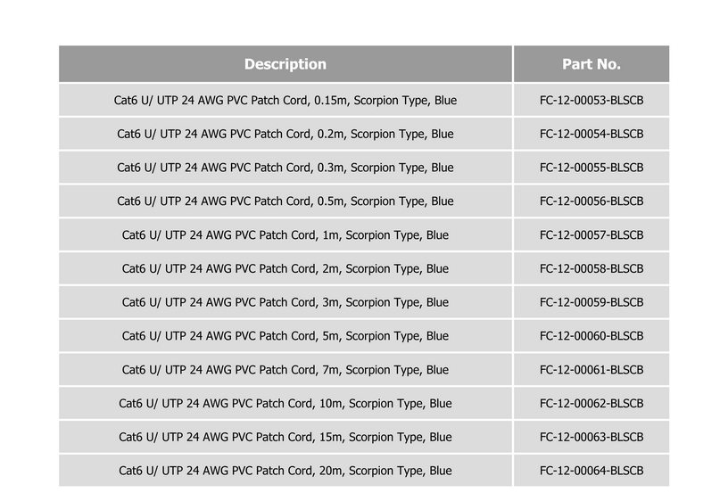 The Cat 6 U/UTP 24AWG PVC Patch Cord delivers high-performance connectivity for structured cabling systems. Designed with a scorpion-type clip boot for easy identification and enhanced strain relief, it features gold-plated RJ45 connectors and bare copper conductors for stable transmission. Available in multiple lengths with color clip options, this patch cord ensures organized installation, durability, and reliable network performance across various applications.