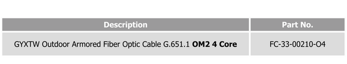 The GYXTW Outdoor Fiber Cable MM 4 Core OM2 delivers stable multimode connectivity using OM2 fibers, featuring low attenuation and high bandwidth performance. Reinforced with dual steel wire strength members and a corrugated steel strip armor, this black HDPE-sheathed cable ensures robust protection for demanding outdoor environments.