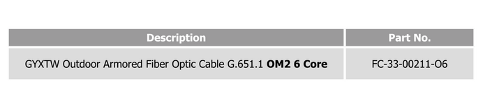 The GYXTW Outdoor Fiber Cable MM 6 core OM2 delivers reliable multimode fiber connectivity using OM2 fibers with low attenuation and high bandwidth performance. Engineered with dual steel wire strength members and corrugated steel strip armoring, this black HDPE-sheathed cable ensures rugged durability for 6-core outdoor deployments.