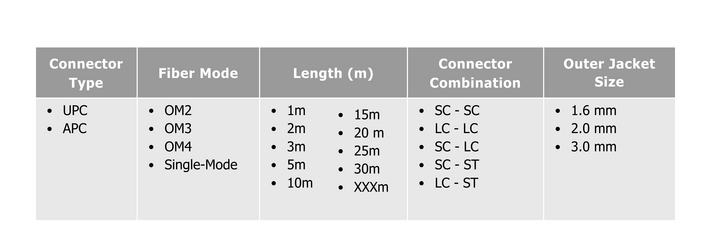 FiberCore Patchcords deliver reliable, high-performance optical connectivity for modern fiber networks. These patchcords are manufactured in the USA with UL certification and built using premium CorningĀ® optical fiber as raw material. Designed for precise signal transmission, they provide flexible, easy-to-install connections between network devices, patch panels, and active equipment.