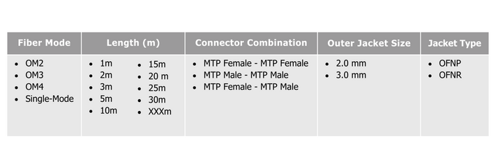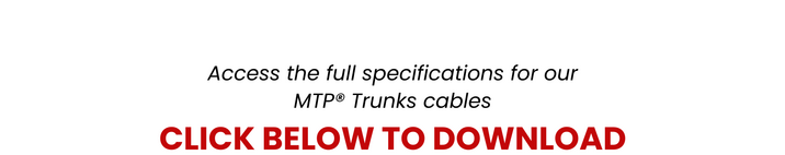 Configurable across a wide range of fiber counts and available in both single-mode and multimode options, FiberCore MTP® Trunks integrate seamlessly into structured cabling systems. Manufactured using components compliant with EU RoHS and REACH directives, they are offered in TIA standard or custom colors, with jacket ratings available in Plenum (OFNP), Riser (OFNR), and LSZH to meet diverse installation requirements.