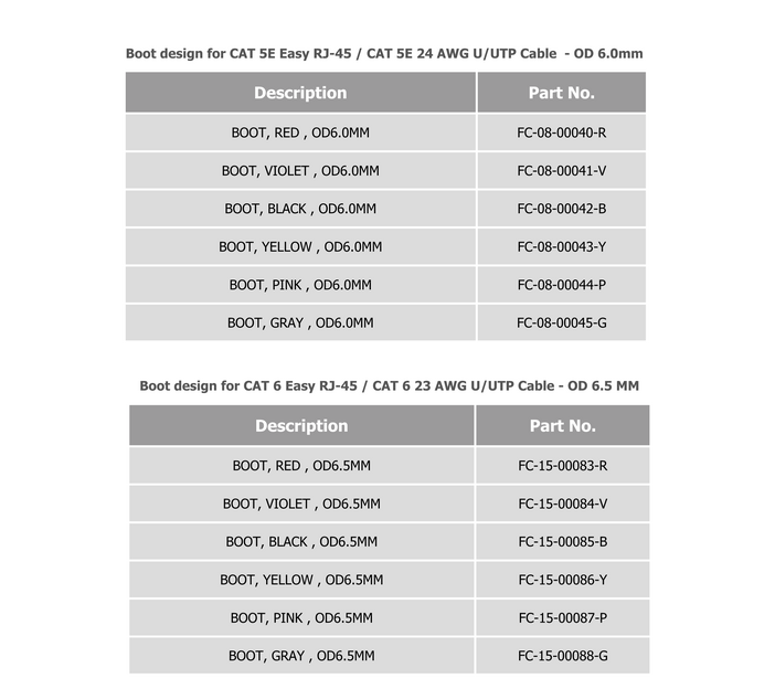 The Snagless Plug Boots provide a simple yet effective solution for protecting RJ45 connectors in structured cabling systems. Designed to prevent snagging during installation and cable routing, these boots are made from flexible PVC material and are available in multiple colors and sizes (OD 6.0mm and 6.5mm). Packed conveniently in 100-piece containers, they ensure organized storage and easy deployment while enhancing cable durability and longevity.